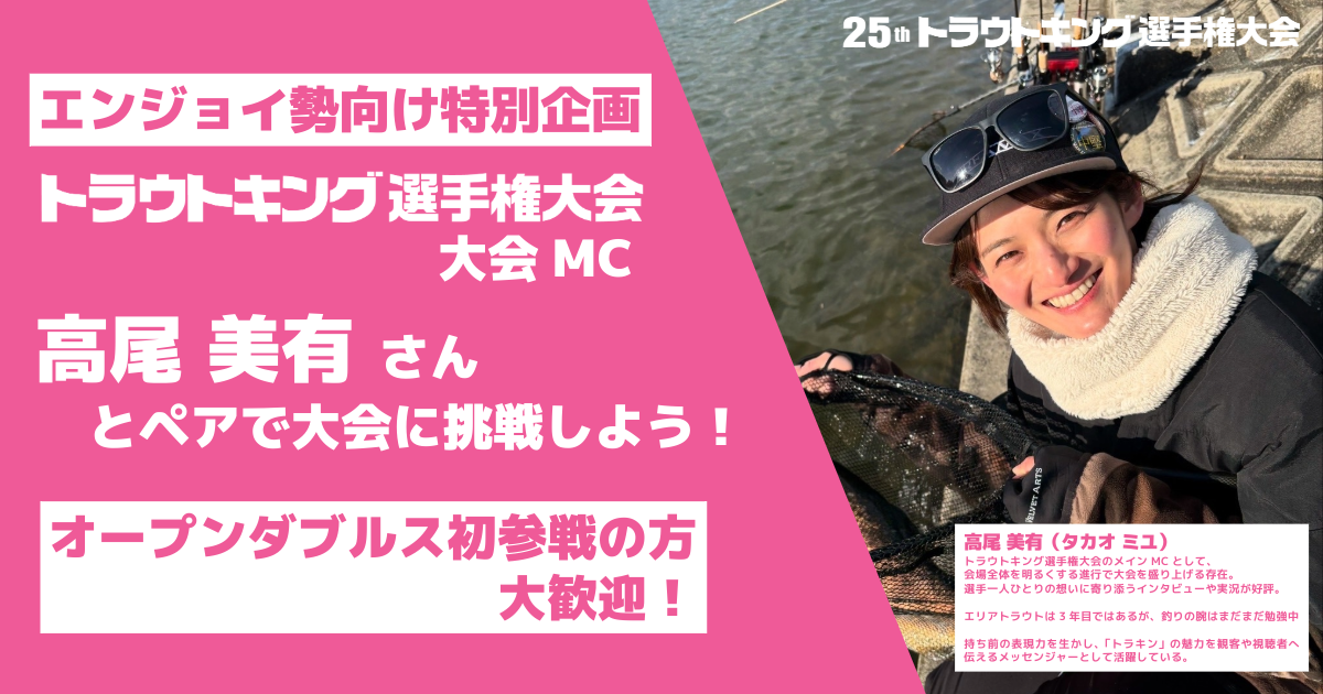 11月8日(土)開催「第25回トラウトキング選手権大会 オープンダブルス第1戦」 にて、大会メインMC 高尾 美有さん とペアで参加したい方を募集します!